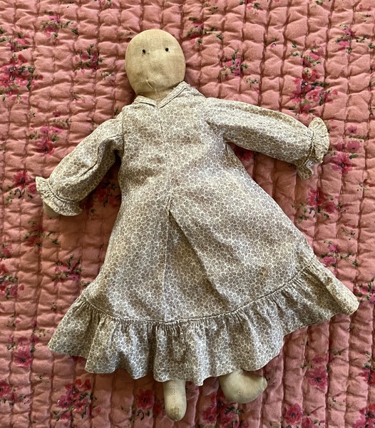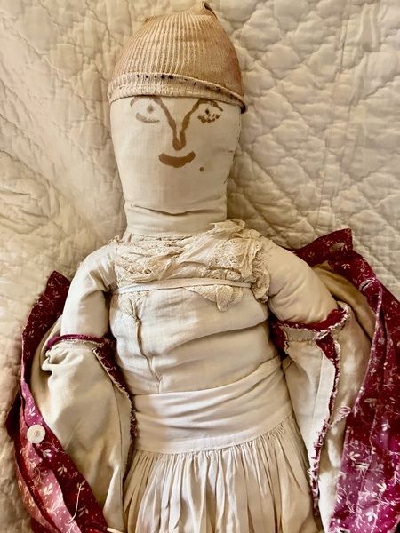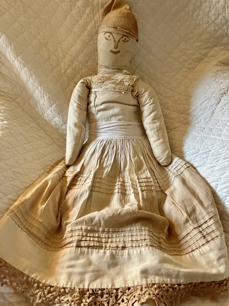 28" tall. She comes with a provenance from Nebraska; hence, "Willa". This is a truly wonderful doll, in all original clothing and even a night cap stitched to her head. Dates to c. 1900, and is incredibly huggable. I am showing her in her undergarments. She has a plum colored calico dress but we think she is so sweet as is. 2 photos.