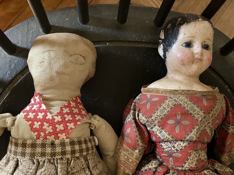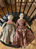 Isn't this adorable? A simple rag doll next to a glorious lady. The lady is 16" long and wears an extraordinary collection of clothing -- complete undergarments, great leather arms and hands, and wonderful leather boots. I am told by a doll-dealer friend that she is German and dates to third quarter of the 19th century. A small piece is missing from the right side of her head, but she is in otherwise admirable condition. The cloth doll has an inked face and a wonderful woolen skirt. c. 1890. Her head is s bit wobbly. I admire them both. 2 photos.