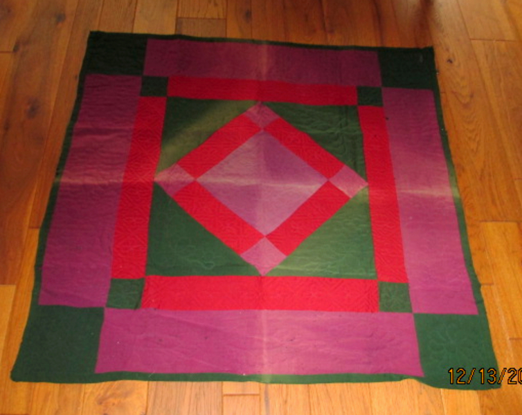 Measures 40" x 40". Purple , Wine and Green.Lovely floral designs. Faded along the fold lines.No other issues.No inside lining.