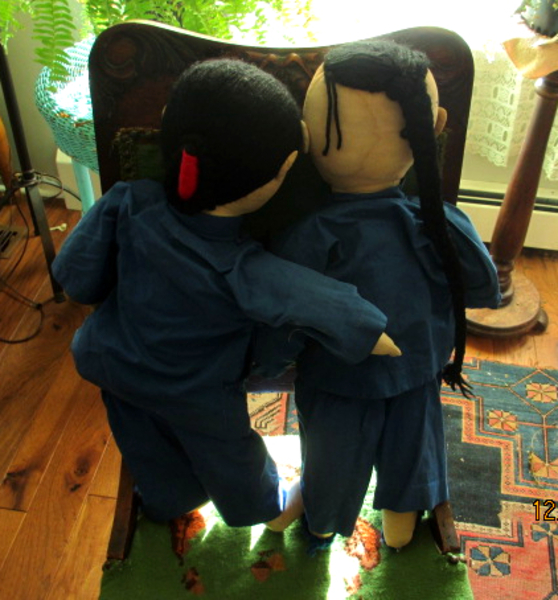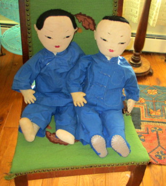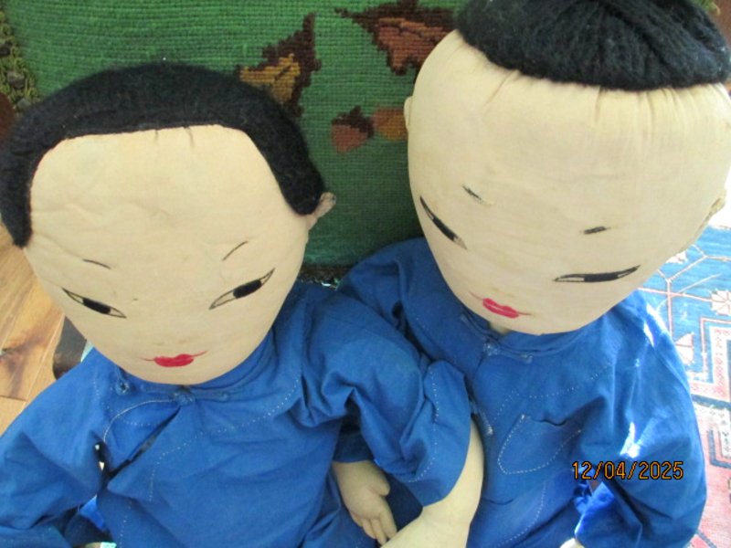 Each measure approx 24 "long.Made by Ada Lum, Farmer Dolls in Hong Kong after 1949. The brother has his blue crocheted shoes.Good clean condition.There is a water stain on the back of one head and a few teensy slits on their faces.These came from a Michigan estate that brought the dolls back from Hong Kong.