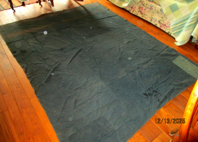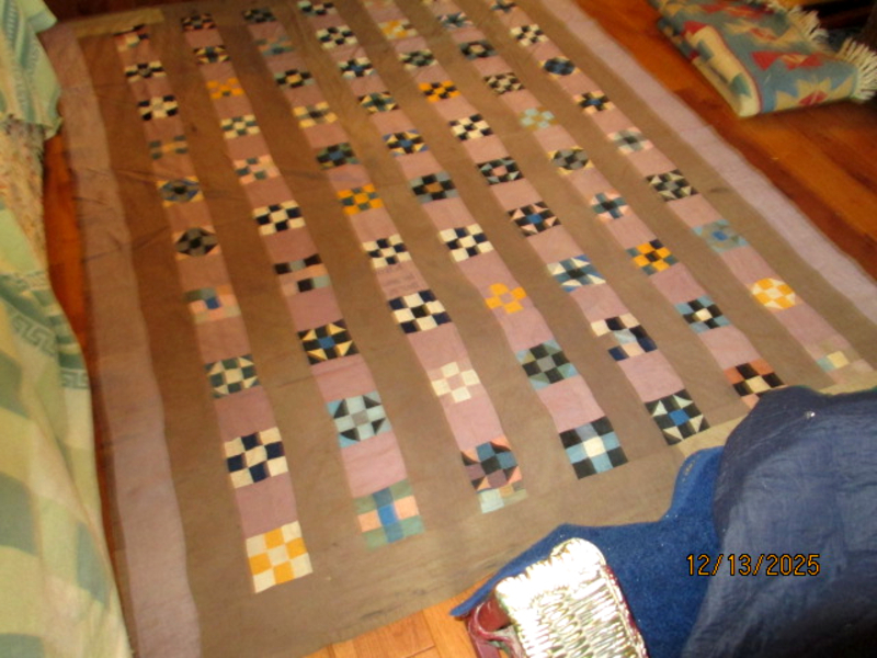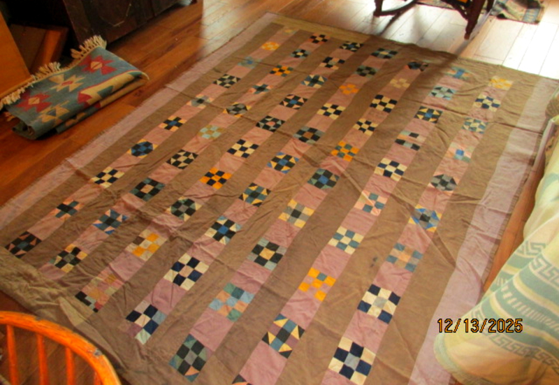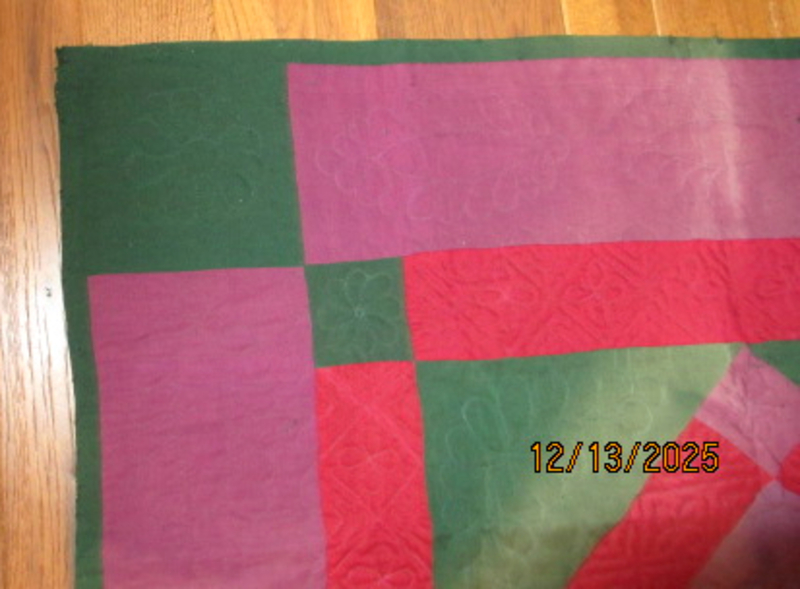 Measures about 82 " long x 66 wide, about. Purchased in Bird In Hand, Penna from the Sadie Esch estate auction,.Unwashed.Some fading on the back, black marks on the front.A tiny patch on the back.Beautiful humble colors of orchid, blue, gold, and pink. No tears.No inside lining.