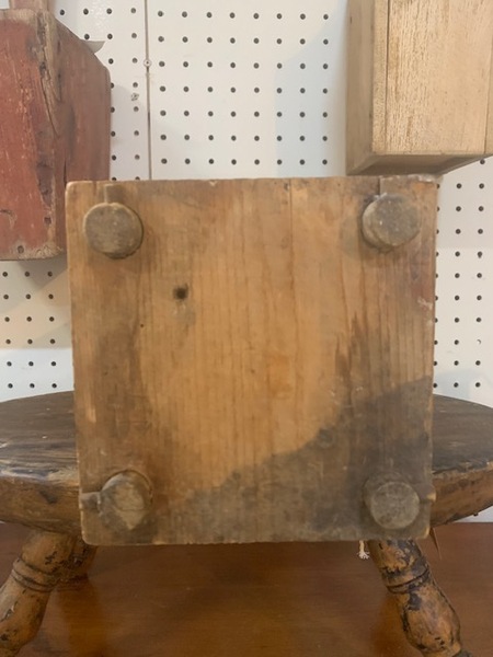 This New England foot stool measures 12 inches wide by 8 1/2 inches deep by 4 3/4 inches tall. The original dark brown paint is worn in all the right places. There is an opening at the top for carry. It is constructed with canted sides and. tiny cut nails.
