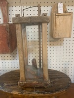 Wood barn lantern with a peg mechanism that raises and lowers candle through the hole at the top. All construction is made using pegs with a few missing, but lantern remains sturdy. Newer glass panels are inserted. wonderful piece, early 1800s'