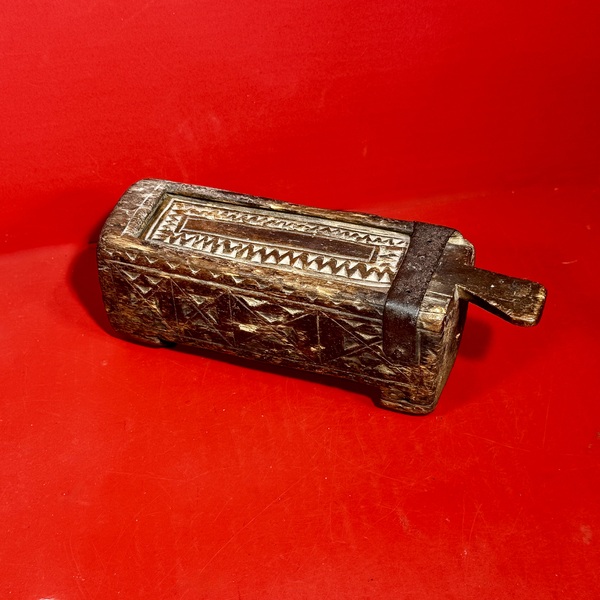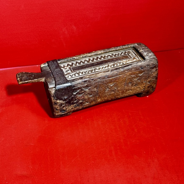 26-016. A miniature chip-carved slide lid box. Suitable for small candles, it was carved from a single piece of pine with all-over geometric chip carved designs. The lid is reinforced with an iron strap secured with rose head nails. This was either part of the original design or a very early, contemporary repair. The box measures approximately 8,25” long x 2.75” wide x 3” high. Possibly an early Pennsylvania German form and dating from the first half of the 18th century. [Provenance: From the Collection of Peggy McClard & Randy Segotta, Weare, New Hampshire.]