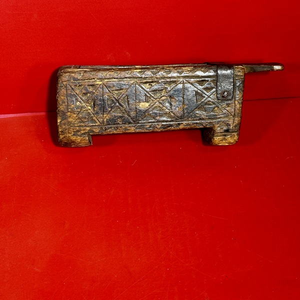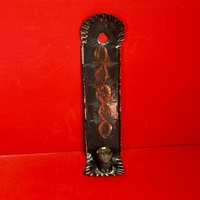 22-112. Hanging candle box with sliding front panel. Carved side panels and a transcultural swastika cared into the back arch. This is a traditional symbol of good luck. A wrought iron hanging ring is at the top. This example is probably continental. I haven’t identified the species of wood used in its construction. It appears to be a combination of hard and soft woods. The surface is a very dark black/brown finish. It measures 13” x x5” x 3”, and 14” high including the iron ring. Ca. late-18th to early-19th century.