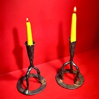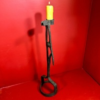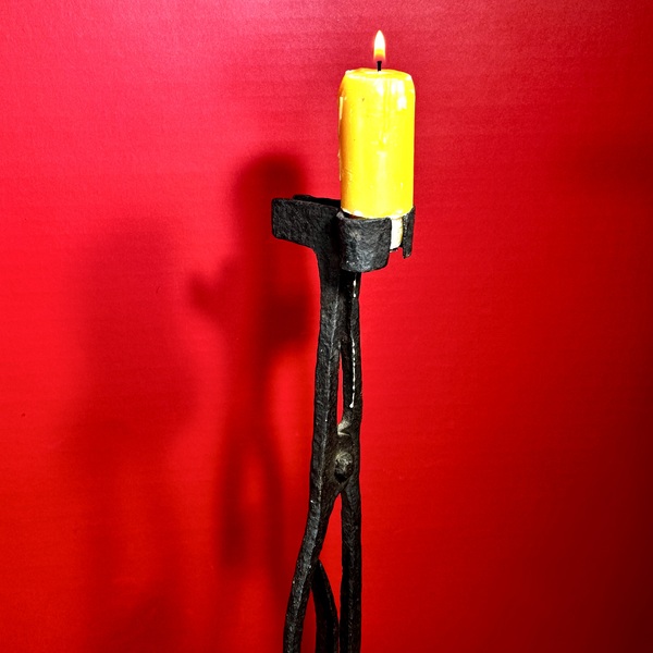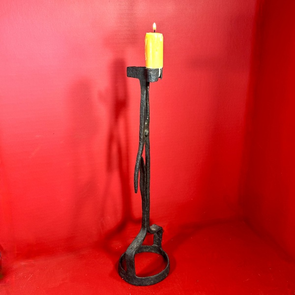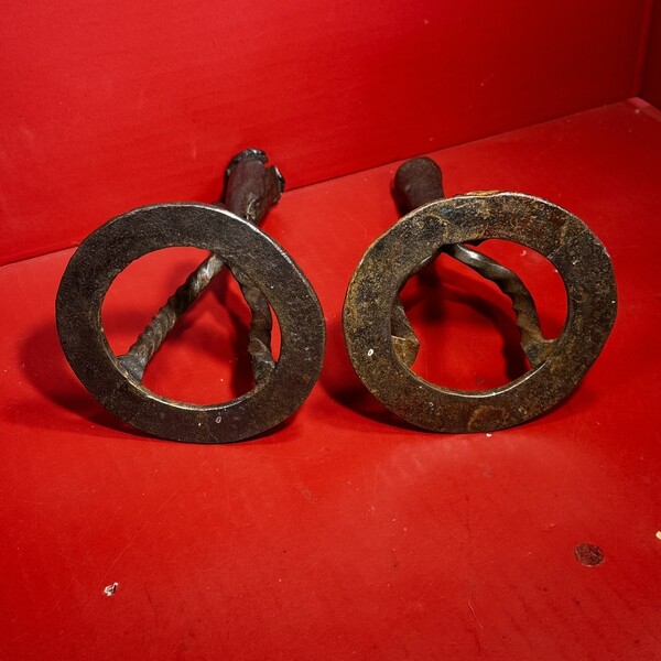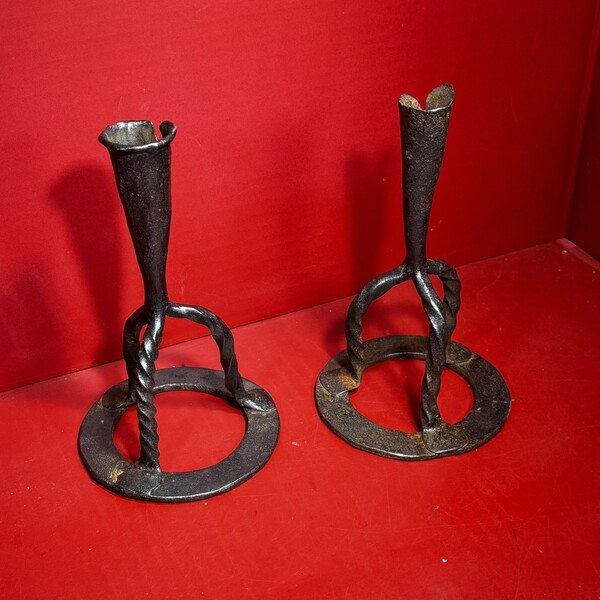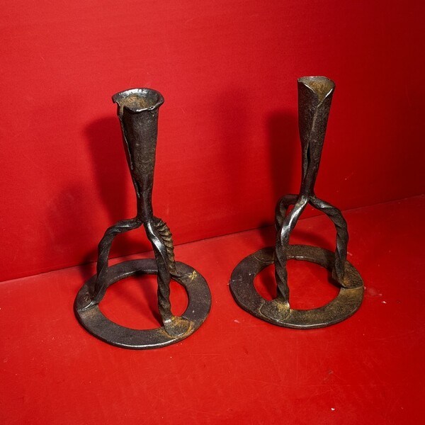 25-188. A pair of hand-wrought iron candlesticks, with twisted tripod supports resting upon ring bases. They are topped by conical, folded candle sockets. Each candlestick measures approximately 8” high x 4.5” in diameter. There are quirky differences between the two, e.g. in the twisted legs and folded candle sockets, while the ring bases are very similar. Because of the slight irregularities’, they likely made as a pair but by a provincial blacksmith. They were found in New England, and date from the end of the 18th into the first part of the 19th century. Charming, quirky, and a nice tabletop size.