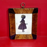 25-183. A miniature folk art watercolor portrait of a young child with a basket. Done on paper, it depicts a full-length portrait of a young child with brown hair wearing a red and black dress and holding a basket. Presented in a period rosewood frame with gilt liner, it measures approximately 4.75"h x 4"w (sight), and 9.25"h. x 8.5"w (framed). American and dating from the mid-19th century. This lovely portrait is in excellent condition retaining bright, vivid colors. Provenance: From the Lifetime Collection of the late Deb Fisher, Lebanon, Ohio.