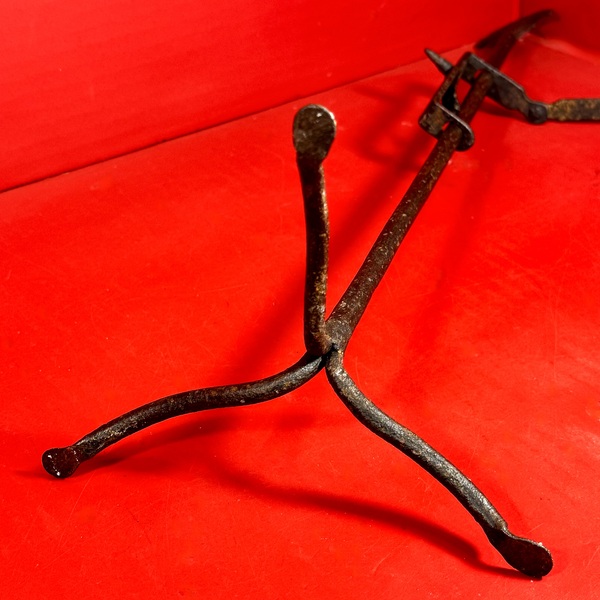 25-094. A nine-candle hand-wrought iron Chanukiah Candelabrum on a three-legged base. With conical shaped wrapped sockets. Measuring approximately 21” high x 16.5” wide. The surface is pitted with some rust, in as-found condition. It was found in upstate NY and dates from the mid-19th century.