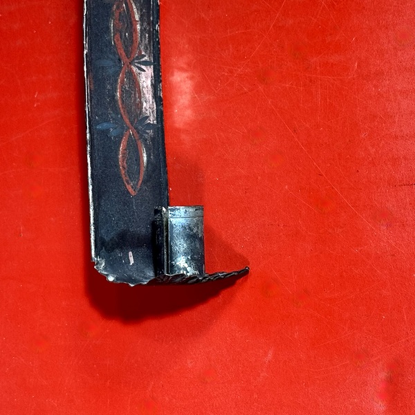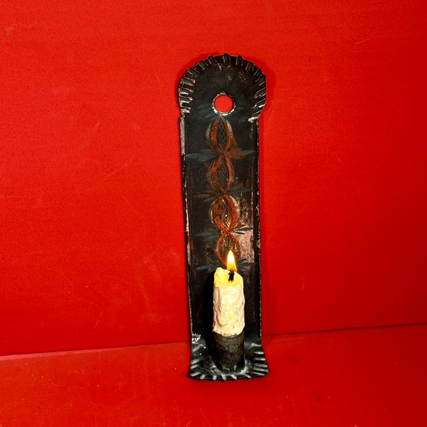 26-020. An unusually small, petite, tole painted tin single candle sconce. Both the rounded top and the rectangular base are crimped. The sides are folded for reinforcement, and a hanging hole is located at the top. It is decorated in a banner Reath like pattern in red, and blue on a black background. The sconce measures approximately 8” high x 2” wide. Attributed to New England and dating to the mid-19th century.