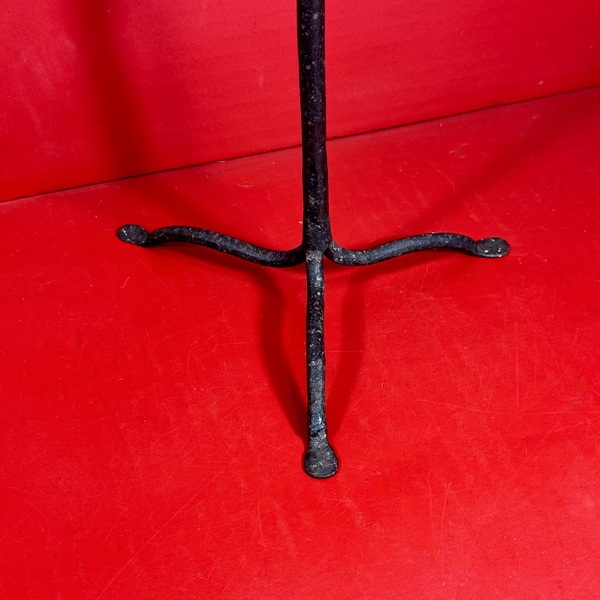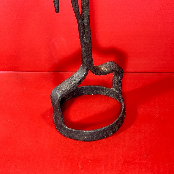 25-166. Hand-wrought iron tabletop paddle-shaped rush light holder, with the highly unusual double conical shaped candle sockets. All three of these holder’s rest on an iron strap which spans a round ribbon shaped base. The lamp measures approximately 12.5" high. It is in good original condition with age-appropriate wear. There are no breaks or repairs. This very scarce form is American and dates from the early 18th century.