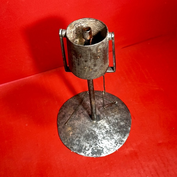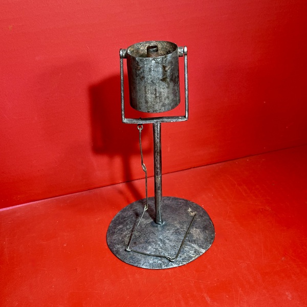 26-004. Pennsylvania fat burning kettle lamp. Constructed of wrought sheet-iron, with a large rivet set disc foot, round stem and trunnion mounted hinge pin-set kettle containing a center wick socket. The kettle retains its wire wick- prick. The lamp measures approximately 8" high x 5” diameter base. It is in very good condition, with its’ original surface and wick-pick. The lamp was made in Pennsylvania and dates form ca. 1830.