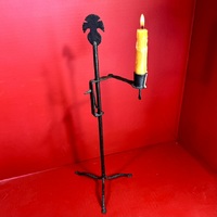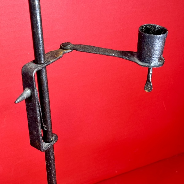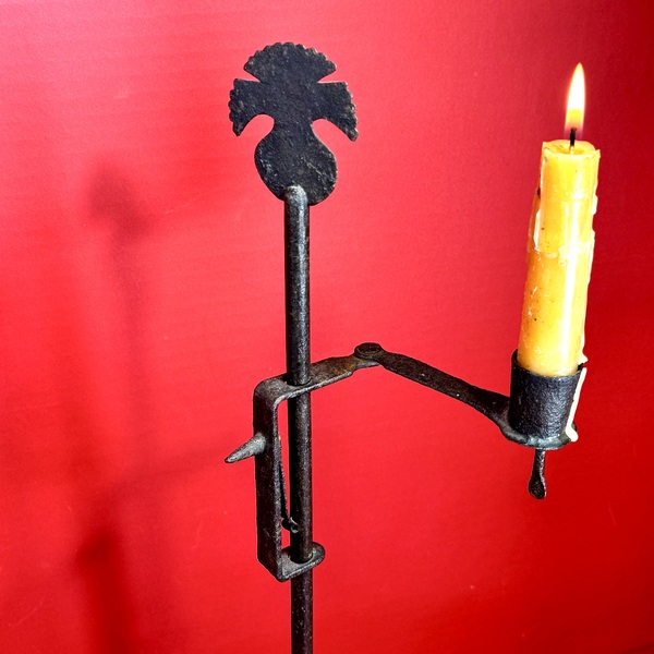26-006. Adjustable tabletop Scribner’s candle lamp. A single post sits on a simple tripod base all of which stands approximately 18” h x 7” diameter. The candle socket is attached to the end of an adjustable, jointed swing arm. The socket is equipped with a push rod to eject the candle nub. This scarce, hard to find example is in very good condition with nice patina. It was found in Pennsylvania, is of continental design and dates from the late-18th to early 19th-century.