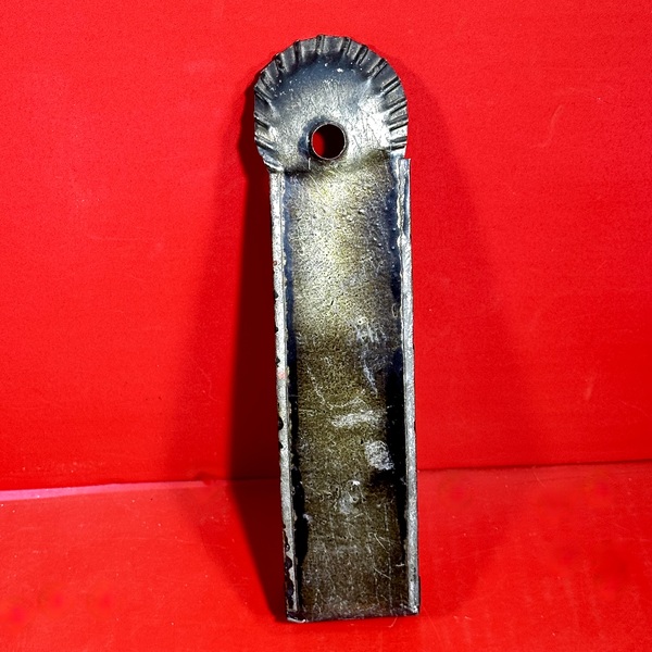 26-005. Early wrought iron, tool decorated, flax seed ripper, dated 1829. Attributed to southeastern Pennsylvania. Hand forged and wrought with bench drive mounting cleats, curled end spikes and thirteen long interior spike-pointed rods all forged to a thumb rail which has dart punchwork designs on both sides and is dated 1829. This is an excellent example of a rural Blacksmith’s work, still solid after nearly 200 years. The ripper measures approximately 15” long x 1.12” thick x 10.75” high and weighing approximately 5 lbs. 2 oz. In very good, work-used condition.
