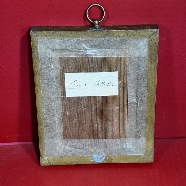 26-014. Gouache and gilt-decorated silhouette portrait of Clara Tittleton. Ca. 1830. Little girl with ringlets wearing a wide-shouldered dress with short puffy sleeves and a ribbon waistband tied in a bow at the back, holding a spray of flowers. In a bird's-eye maple frame with inset rosewood corners. An ink inscription on the reverse names her as Clara Titteton. Frame, 7.5"h. 6"w. [Provenance: From the Collection of Peggy McClard & Randy Segotta, Weare, New Hampshire.]