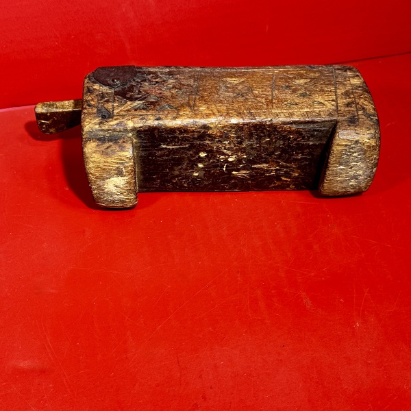 25-163. Carved wooden Heart-Form Maple Sugar Mold with a central design featuring the letters “A R T”. The mold sides are removeable to aid removal of the sugar mold. The whole piece measures approximately 8” long x 4.5” wide x 2” deep. An excellent functional primitive form with a very intriguing central design. In good condition with expected wear. Originally from New England and dating from ca. the mid to late-19th century.