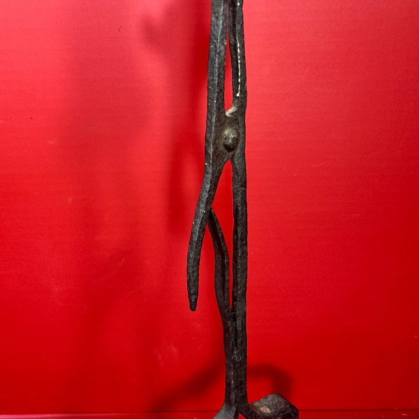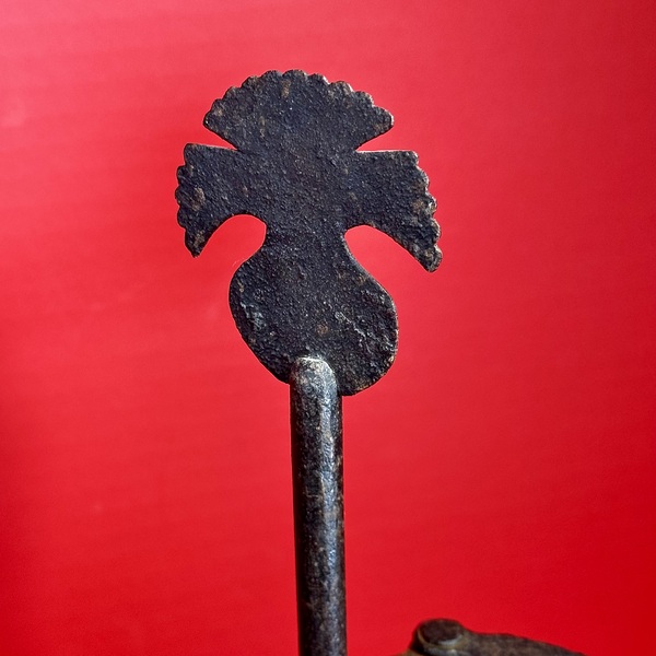 25-167. Wrought and cast-iron miner’s fluid lamp, referred to as a “Frog”. Sturdy built with a snug cap on the filling port secured by a threaded screw in the form of a Rooster. Possibly French, ca. mid-19th century. Measuring 23.5” ling x 5” in diameter, in very good condition. Lighting Devices: All Lighting Devices: Fluid Lighting Devices: Wrought Iron