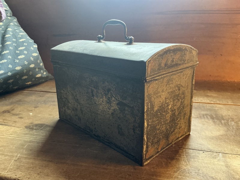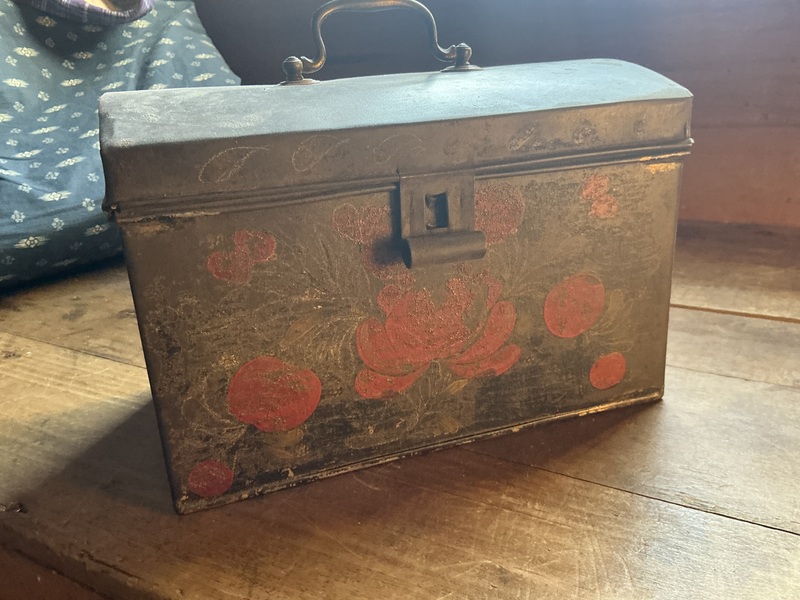 6 1/4 by 6 1/2 by 5 1/2 inches and quite nice. Old paint and very nice original handle on top, don’t see these much. The lid stay tight even though the little piece that holds the catch is missing. See pics.