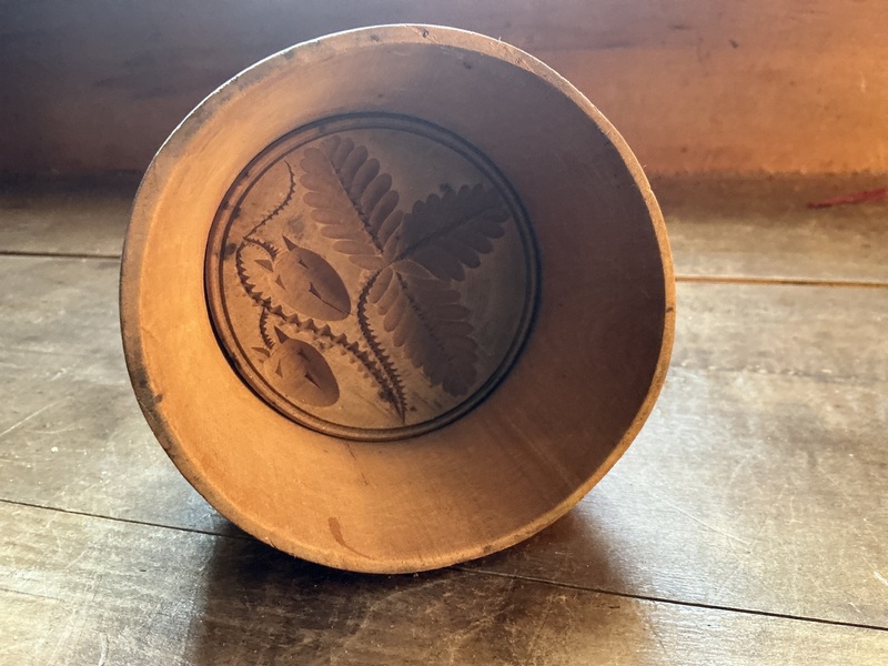 Footed wood bowl measuring 11 by 105/8 inches and about 2 3/4 inches tall. Nice no damage