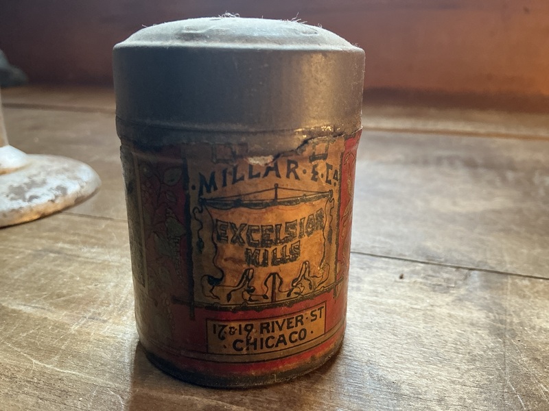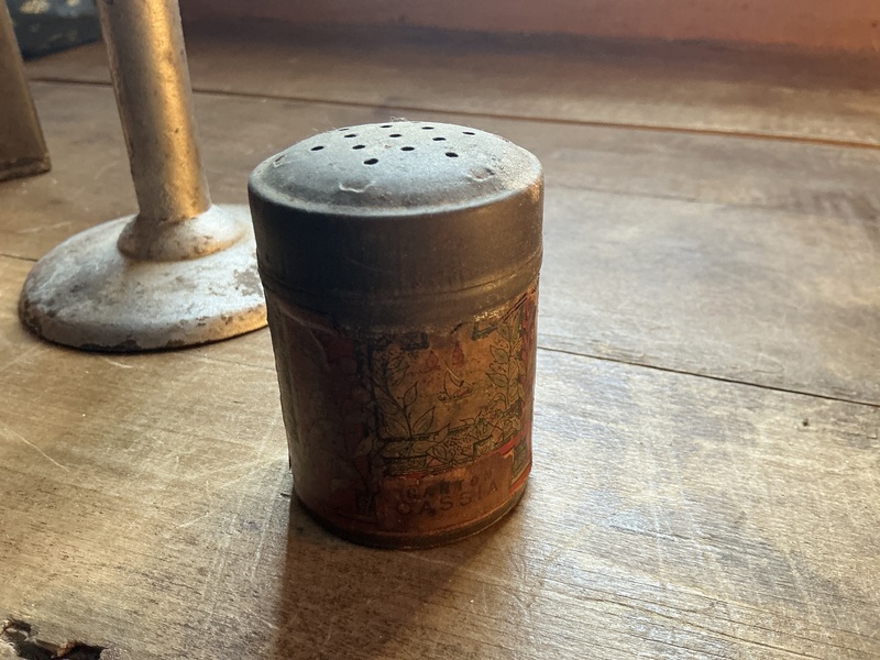 About 2 1/2 by 2 inches tin can with star pattern sprinkle top. It has most of the paper label.