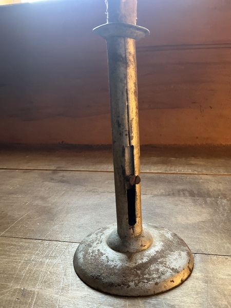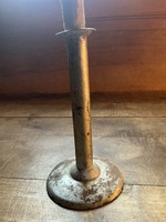 7 inches tall and nice but has a replaced push up with a screw. Top is a bit crooked but works and quite nice for age. Nice and straight nor crooked.