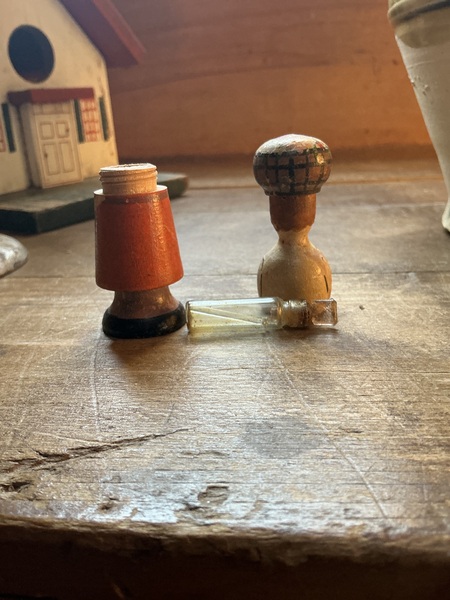 3 1/2 inches tall perfume holder with threaded top for tiny glass perfume bottle inside. I don’t get the top off the glass bottle and the little glass dipper is loose.
