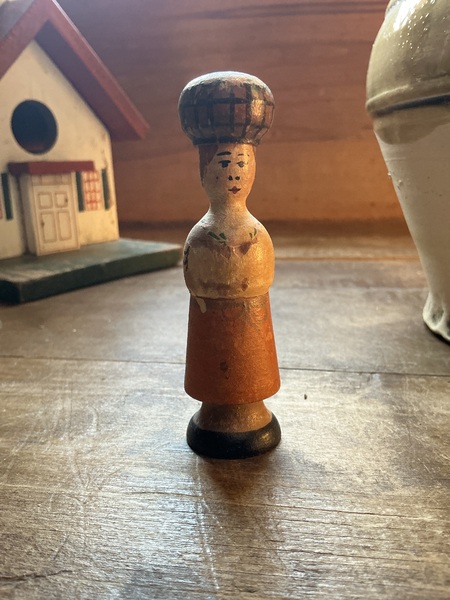 7 1/4 inches long and has a face like a art fabric mills cloth dolls. Funny body is made from an old feed sack