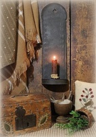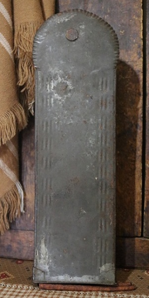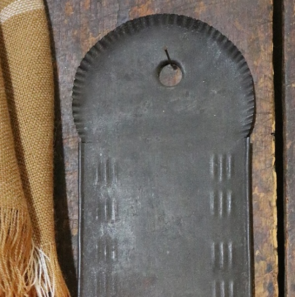 🕯️Nice early wall sconce dating to the late 18th to early 19th century exhibiting a decorative ribbed crest around the top edge, folded over sides (back location) and is cleated at the bottom. Candle is included. A series of independent triple raised lines in a vertical position grace the opposing sides. Two tiny cracks appear on both edges where the crest terminates to the body. Back shows light surface rust along with soldered areas near the bottom. A couple of white tiny specks located near the front hanging hole. Overall good condition and is certainly tempting for anyone who enjoys collecting early lighting pieces. Stands 13 ½” tall, measures 4 ¼” across the top, measures 4” across the middle section and measures 2 ½” deep front to back (candle drip pan area). More pictures available.