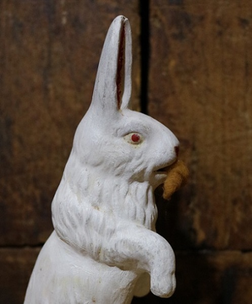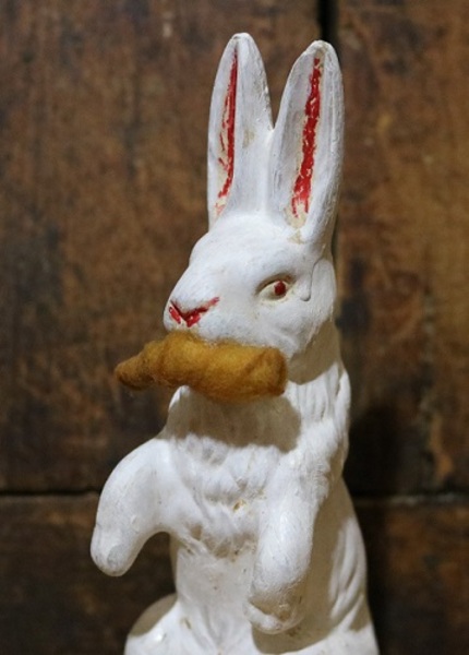 🐇White rabbit holding a spun cotton carrot in his mouth will certainly not go hungry as he borrowed it from Mr. McGregor’s Garden. Hand painted features include crimson red accents on the ears, mouth and eyes having a folk-art appearance. Marked “Japan” on the right side near the bottom edge and most likely is pre-World War 11. The bottom cover is missing. The feet show an applied appearance referencing the top and bottom areas. Good overall condition. Stands 5 ½” tall, measures 1” across his head and bottom measures 1 ¾” across and measures 2” from the foot to the back of the tail. More pictures available.