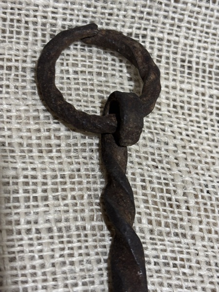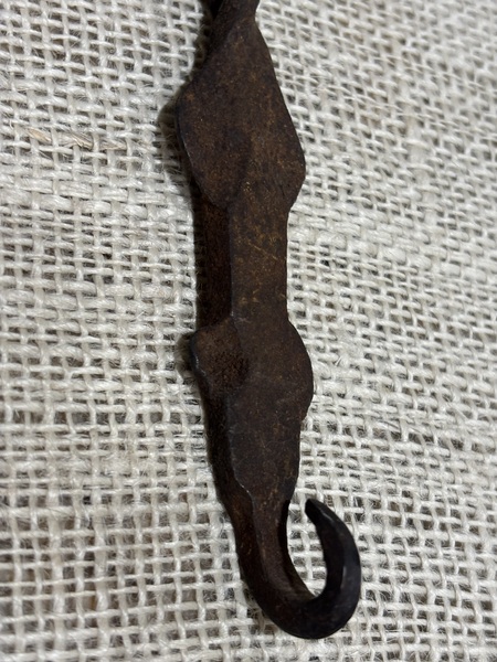 Rare 18th century wrought iron hook. Primitive twist work throughout including on attached loop for hanging. Measures 8"long.