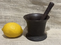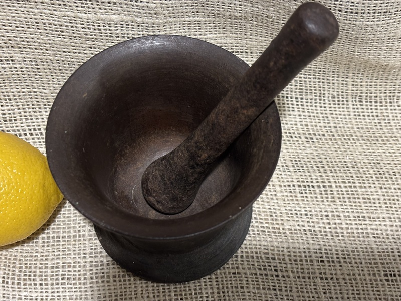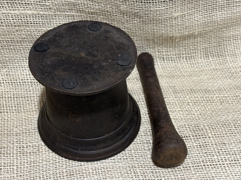 Sweet small size iron Mortar and Pestle. Early 19th century, nice turnings. Measures 4 1/8" top diameter, 3 5/8" high, pestle 5 3/4" long.