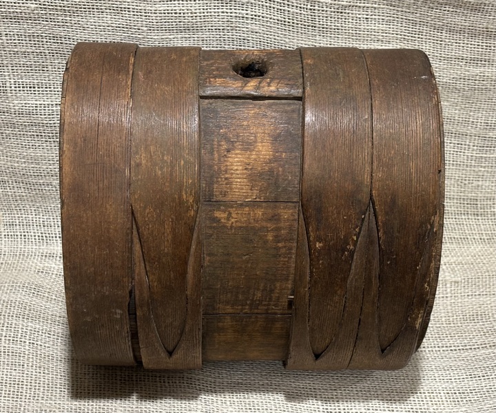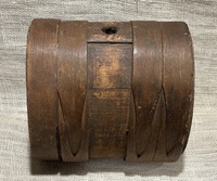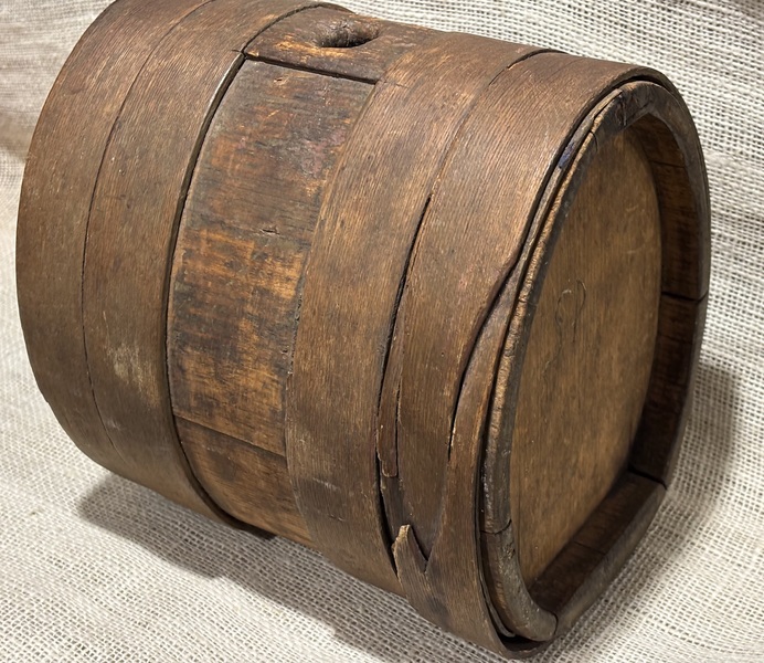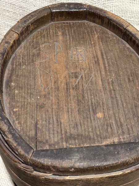 American Revolution Era canteen. Staved construction with interlocking wooden hoops. Minimal remnants of red paint, but nice warm patina. No signs of ever having strap. Initials carved on both sides "SP". As seen in photos cracking and loss on 1 hoop/band. Measures 9" long, 9" high triangular base.