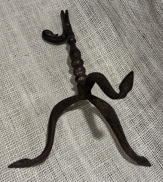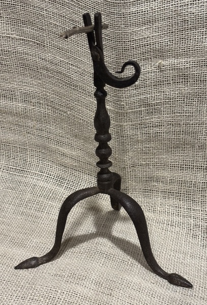 Rare, wonderful iron spring action splint/rush holder. Late 18th/Early 19th century, great surface. Sweet rat tail's end on jaw. Tripod base with penny feet. Measures 10" tall.