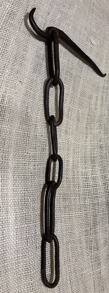 Rare 18th century wrought iron spike chain hanger. 6 links attached to spike. As seen in photo tip of spike is bent. As found from a large collection of iron from a Connecticut estate. Great patina! Spike measures 8 1/4" long, chain 15" long.