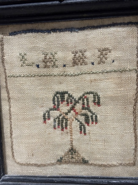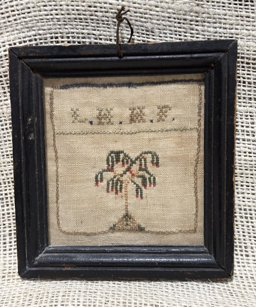 Wonderful early miniature needlework sampler. C. 1825 willow tree with initials. Period frame. Light toning, overall excellent condition. Measures 4 1/2" wide, 4 3/4" high. From Nancy and Gary Stass collection.