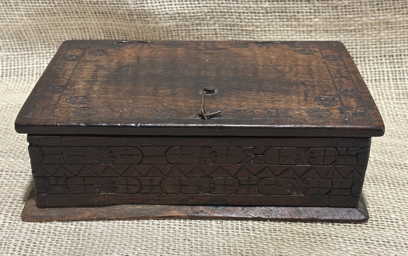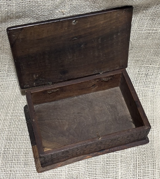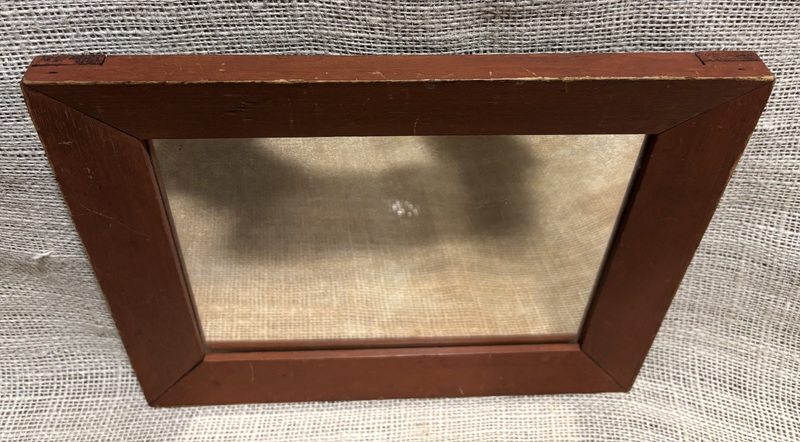 Sweet dated miniature painted box. Inscribed on top "17-a heart-47". Pine with red stain, dove tail and small square nail construction. Original snipe hinges. Just a very sweet little box! Measures 4 7/8" x 2 7/8" x 2 1/2" high. From Collection of Matthew King.