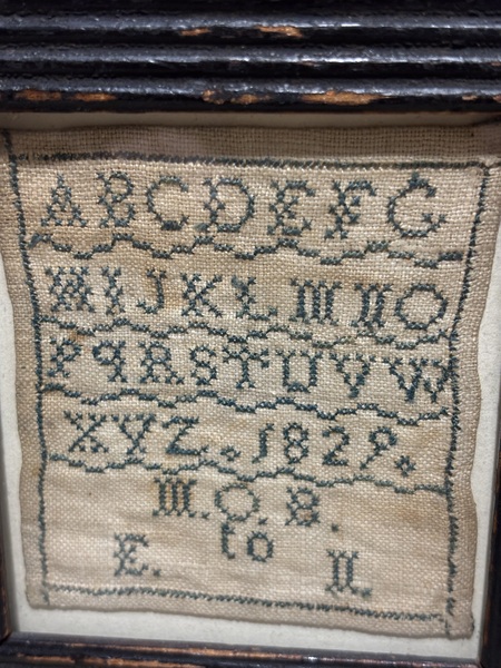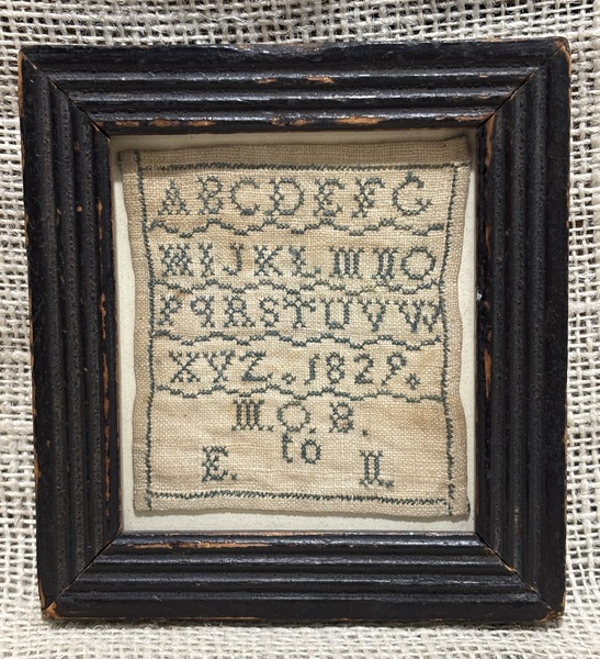 Wonderful miniature alphabet sampler. Dated 1829 and signed. Period frame. Light toning, otherwise overall excellent condition. Measures in frame 4 1/2" wide, 4 7/8" high. From Nancy and Gary Stass collection.