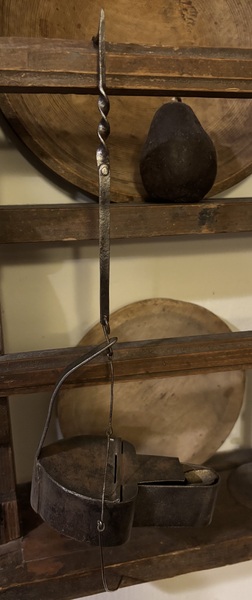 Nice early 18th century fat lamp. Wrought iron, pan form with original hanger. From a Massachusetts estate. Pan measures 3 1/4" x 3 1/2", 3" high. Hook/hanger measures 11" long.