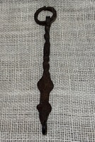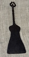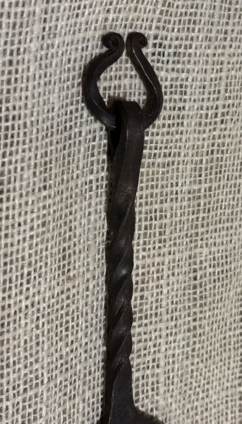 Wonderful 18th century wrought iron keyhole spatula. Nice twist work handle with rat tail end. Attached loop with matching twist and 2 rat tail ends. Measures 9 1/2 inches long.