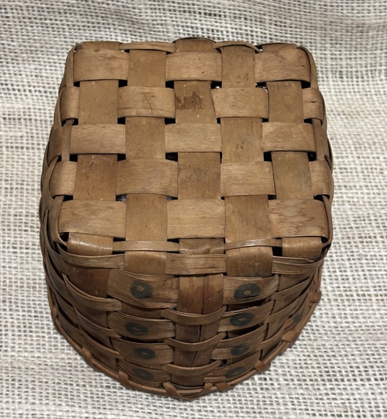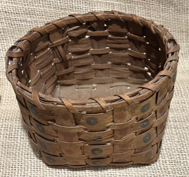 Sweet Native American berry basket. From New England, 19th century with stamp decoration. Great dark patina! In overall excellent condition. Measures 5 1/2" -5 3/4" top diameter, 3 5/8" tall.