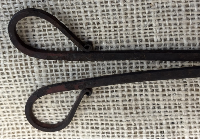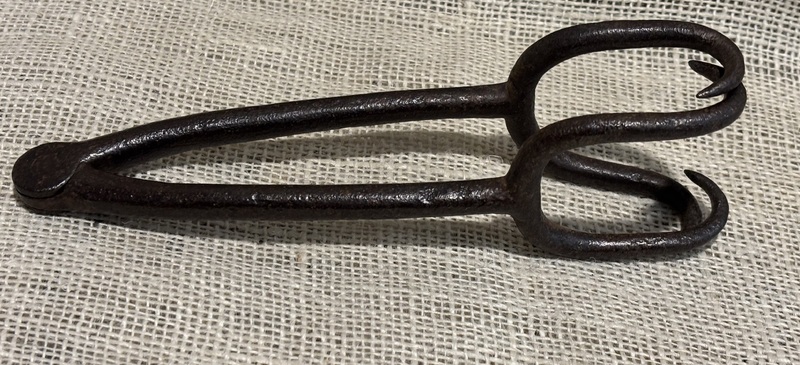 Rare wrought iron tongs. Late 18th century, nice surface. Small size, possibly corn tongs. Measures 8 1/4" long