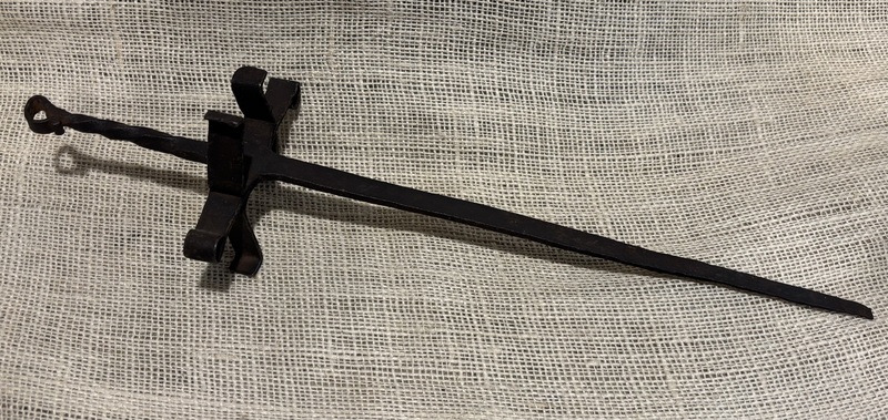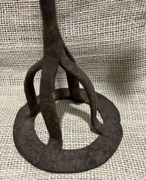 Wonderful 18th century forged iron trammel candleholder. More delicately made than usual. Stamped with initials IM on top of sawtooth portion. Rats tail end on top of hanger and bottom portion of trammel, and under drip pan of socket. The surface is pitted with some rust, in as found condition. Extends from 17-25 1/2".