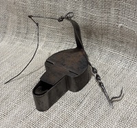 Wonderful Pennsylvania wrought iron betty lamp. Single valve, early 19th century, swing lid with original pick wick. Sweet bird finial typical of Pennsylvania Dutch/German examples. Measures 4 1/4 inches across valve, 2 3/4 inches wide, 4 1/2" high, hook 4 3/4" long.