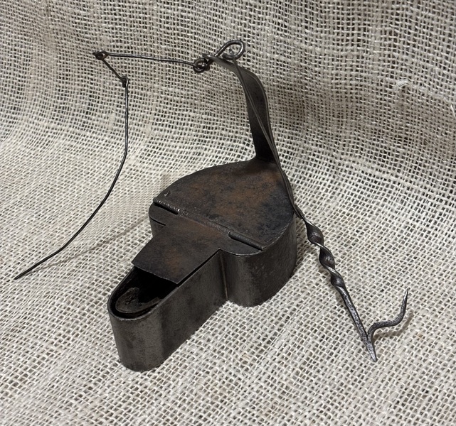 Nice early 19th century double valve cruisie lamp. Wrought iron, from a Massachusetts estate. Measures 4" x 2" x 11" high, including hook.