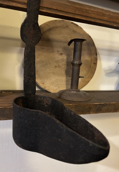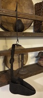 Rare large 18th century wrought iron fat lamp. Rounded bottom of pan so can only be hung. Measures 17" long from tip of hook to bottom of pan, pan is 2 3/4" wide, 5 3/4" deep, 2 1/2" high.