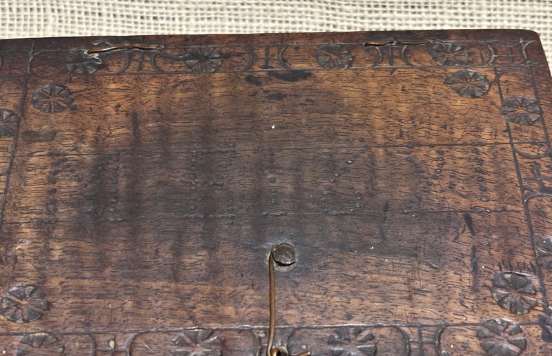 Sweet early footstool with hooked upholstered top. Primitive floral design. Measures 13" x 8 1/2", 7" high.