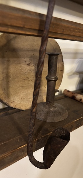 Nice 18th century wrought iron loom light. Part twistwork stem with open rolled socket. Rust and pitting as expected for age. Measures 16 1/8" long.