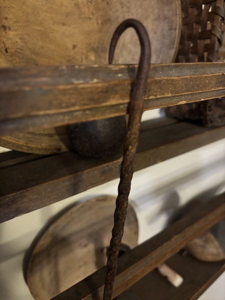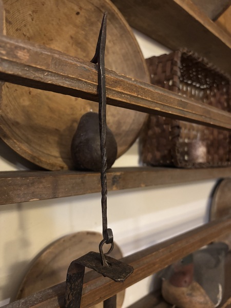 Wonderful 18th century wrought iron spit. Twistwork near handle end with rat tail end. Similar to example in "George Neumann's -Antique Country Furnishings"-pg. 173. Great surface, missing pointed tip although end is smooth to touch so most likely early break. Measures 16 1/2" long.
