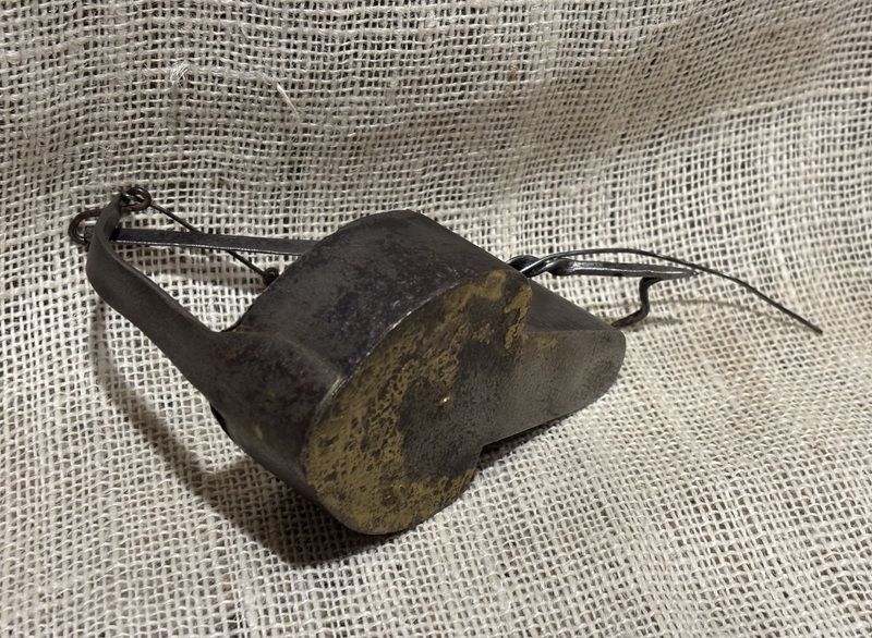 Early 19th c. tinned iron betty lamp. Nice hinged hanger, with pick wick. Some gold-colored metal on bottom as seen in photos-looks like colored solder but I don't see any sign of repair on outside or inside. Measures 5" x 3" x 5" high. Hinged hanger 6 3/4" long.