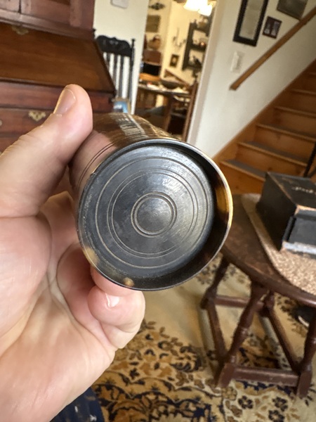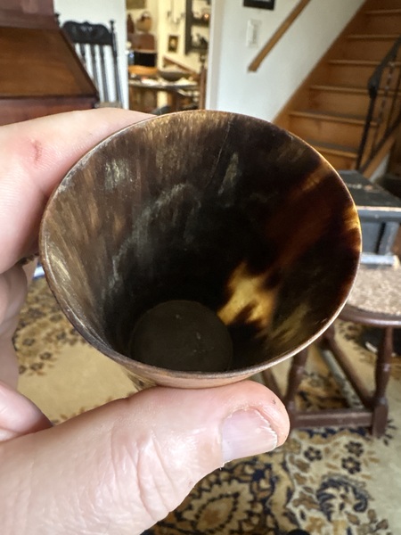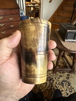 This is a perfect example nice color patina drinking cup. The color is great good 4 inch size and 2 1/2 inches in diameter . Perfect condition and seen carried during the Rev War period 18th century. NOTE nice lines deeply carved in top bottom and middle. No damage!