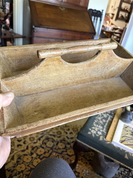 Just the way you like to find them. Untouched with red thick paint over white. This cutlery tote has square nails and in super condition. Dating 1800-1830 and measures 12 inches by 6 inches. Condition: worn paint but original